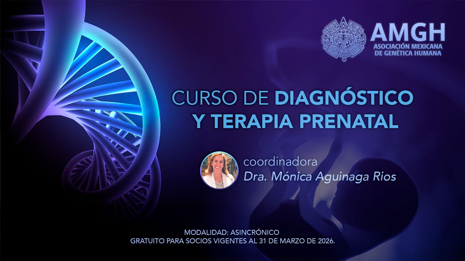 La Asociación Mexicana de Genética Humana extiende la cordial invitación al curso de diagnóstico y terapia prenatal, una experiencia de alto nivel que será coordinado por la Dra. Mónica Aguinaga Rios, la modalidad será asincrónico y será gratuito para socios vigentes al 31 de marzo del 2026. Este curso estará disponible a partir del 1 de abril del 2026 en línea, teniendo la oportunidad de escuchar a ponentes reconocidos en el campo.